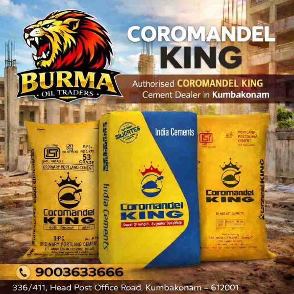 Burma Oil Traders is a trusted building materials supplier in Kumbakonam, providing high-quality construction products for residential, commercial, and industrial projects. We offer a wide range of materials including UltraTech Cementi-Steel TMT BarsJK White CementJK Wall PuttyJK AdhesivesFosroc waterproofing chemicals, Havells wires, fans and switches, and ABRO interior building products. Known for genuine brands, competitive prices, and reliable supply, Burma Oil Traders is the preferred choice for builders and homeowners searching for cement dealers, steel suppliers, electrical products, and waterproofing materials in Kumbakonam.